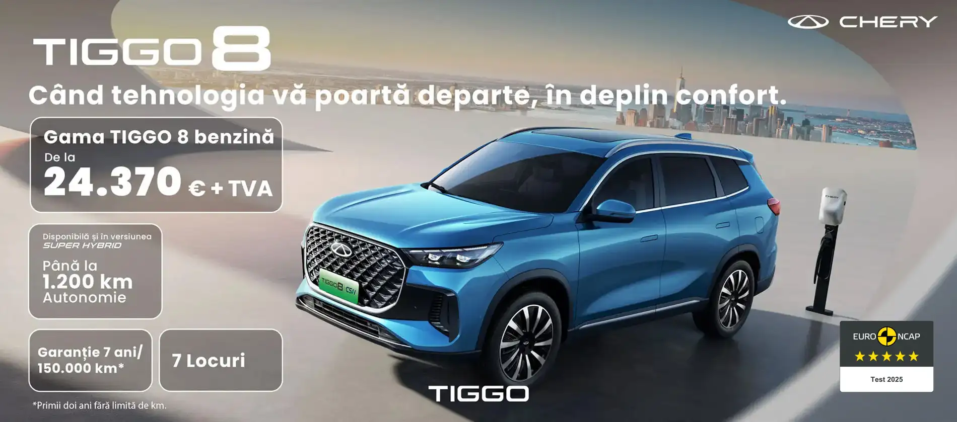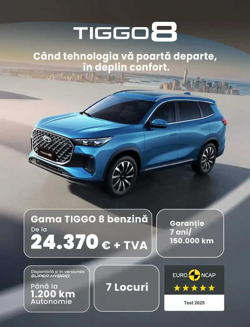 Ofertă pentru TIGGO 8, 1.6 TGDI 7DCT 147 CP, versiune Luxury, pentru persoane juridice. Ofertă pentru persoane fizice: 29.488 euro (TVA inclus), respectiv 149.504 lei (TVA inclus). Valoarea în lei este calculată la un curs estimativ de 1 euro = 5,07 lei și poate varia în funcție de cursul valutar din data achiziției.