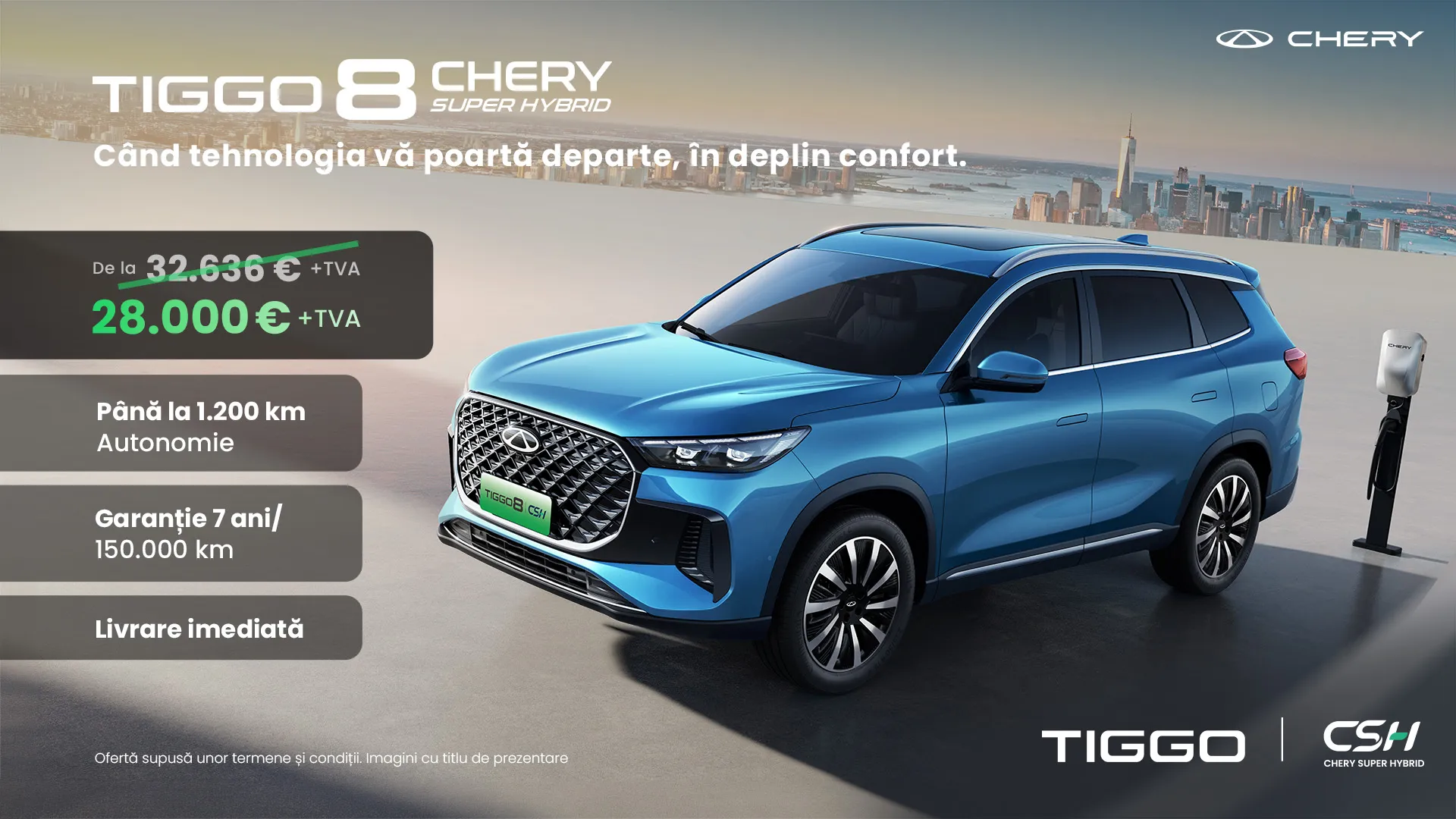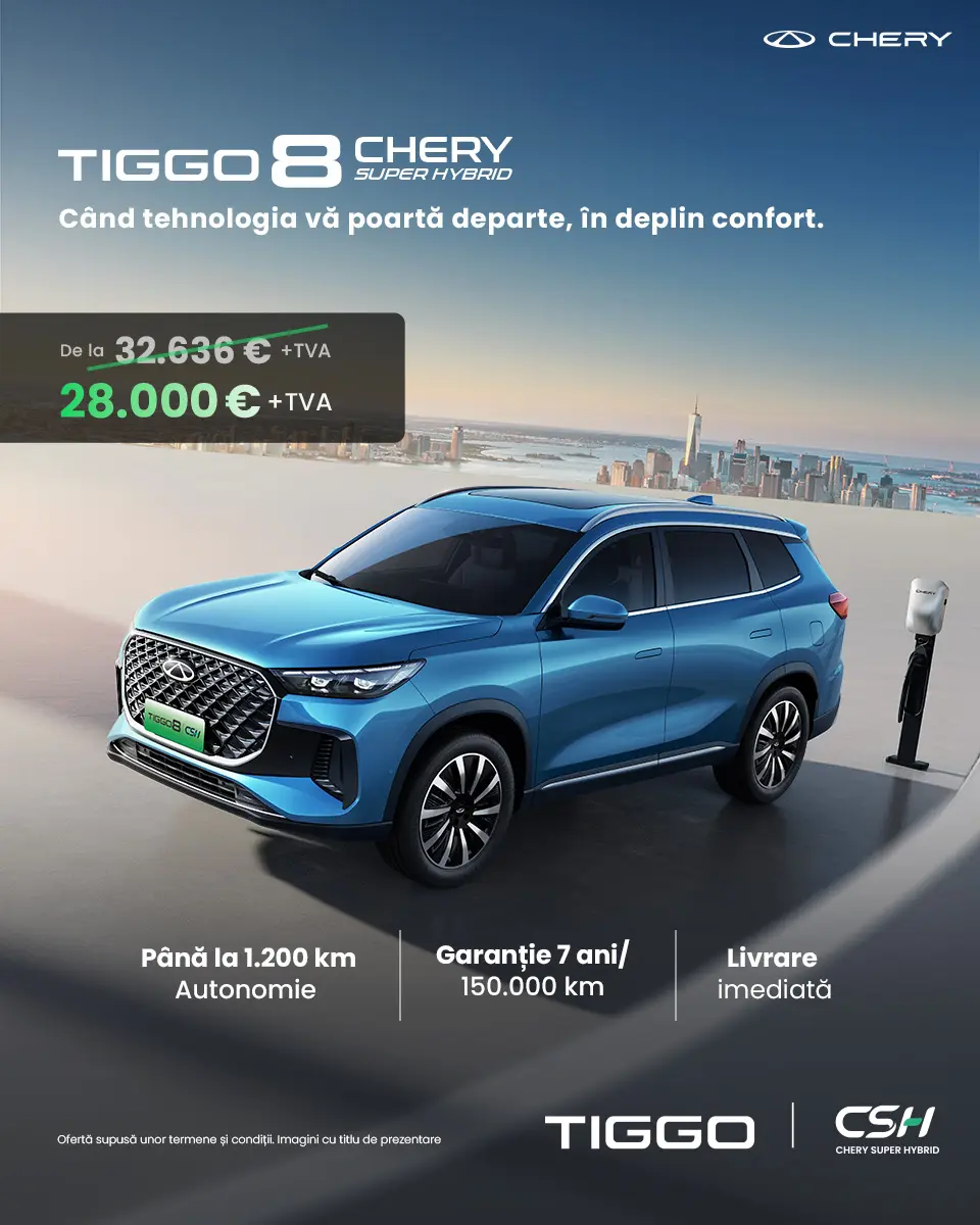 Ofertă pentru TIGGO 8 CSH, 1.5 TGDI DCT 279 CP, versiune Luxury, pentru persoane juridice. Ofertă pentru persoane fizice: 33.880 euro (TVA inclus), respectiv 171.772 lei (TVA inclus). Valoarea în lei este calculată la un curs estimativ de 1 euro = 5,07 lei și poate varia în funcție de cursul valutar din data achiziției.